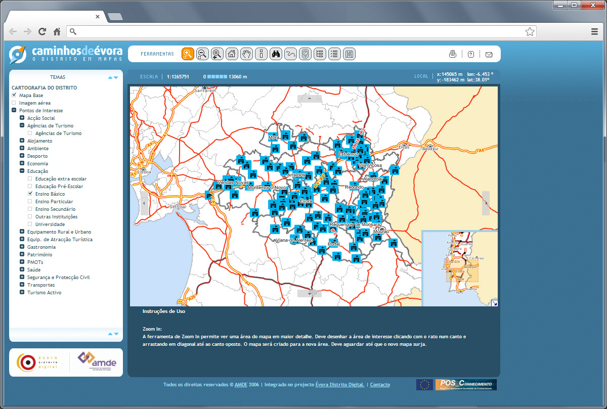 Through a quick navigation it's possible to have a glance over the Évora region map and zoom in on the chosen city or on the point of selected interest. In a few seconds you can travel directly to the chosen place.